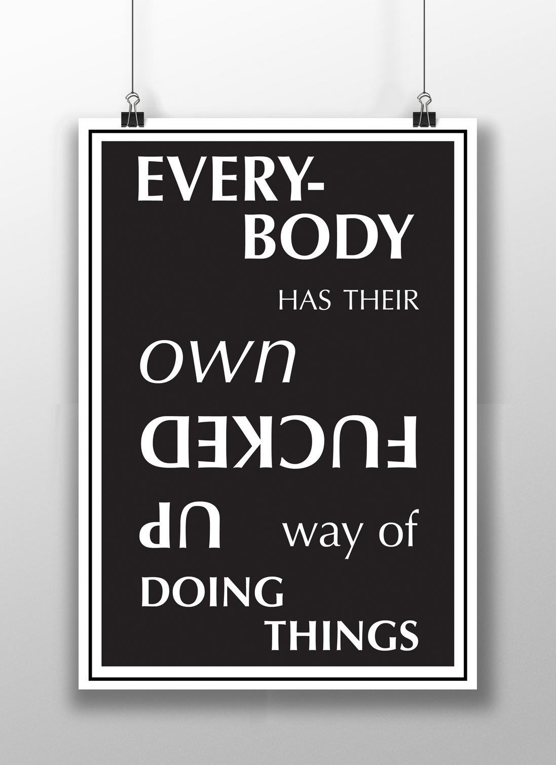 My brother, who is a boat builder in Ontario, Canada said a friend of his used to say, "Everybody has their own fucked up way of doing things." Sounded like good poster material.